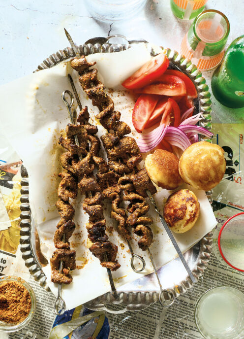 - Serve the skewers with the yajin kuli, onion and tomatoes.